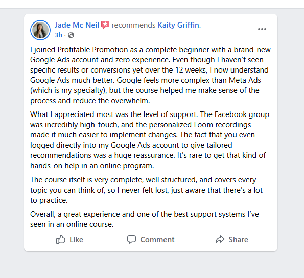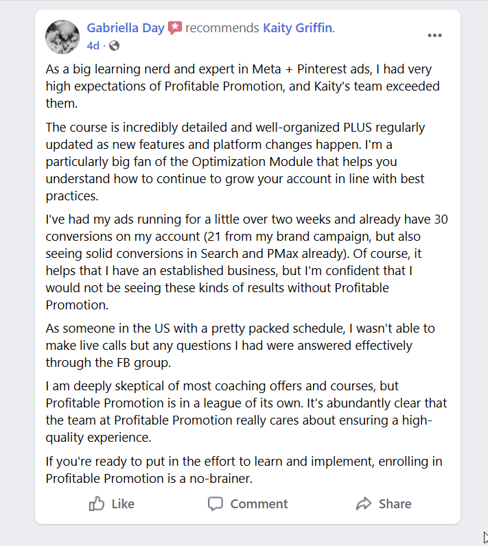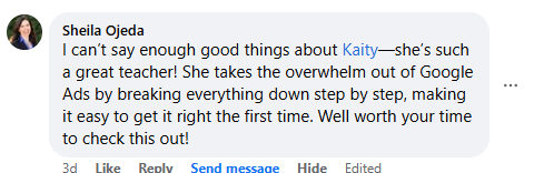 Kaity’s Profitable Promotion course is the gold standard when it comes to Google Ads training.