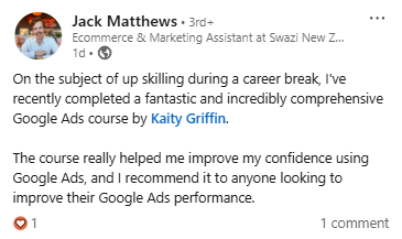 Before the course, I would not have had the confidence to pitch Google Ads as a service, despite having someone on my team that is experienced.